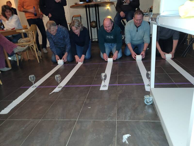 Dit jaar geheel in het thema: landen. In een goed gevuld eigen gilde lokaal, werden 10 teams gevormd met ieder hun eigen landen vlaggetjes. Ook hadden we dit jaar weer de doe opdrachten die tot veel hilariteit zorgden. Zonder handen een koekje in je mond laten zakken vanaf je voorhoogd, was niet voor iedereen gemakkelijk. En een wijnglas tot de rand toe gevuld op een wc-rol over een afstand laten glijden was erg moeilijk. De velletjes werden snel nat waardoor de opdracht steeds moeilijker werd. Na 6 vragen ronden en 3 doe opdrachten waren de winnaars bekend.